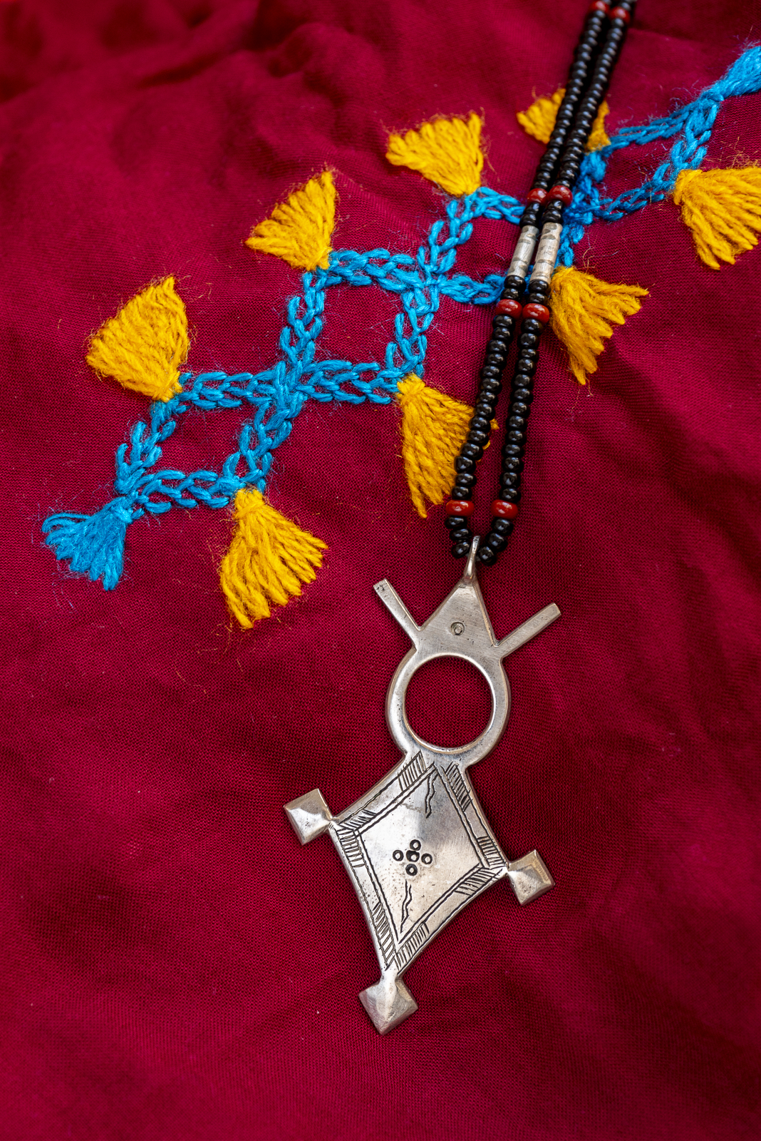 They are images that silently tell the story of an ever-living tradition. Behind these simple patterns lies a part of the cultural identity of the Amazigh. It is an identity which, in both art and material culture, takes on an unmistakably feminine hue: it is the women who create most of these symbols in their textiles, tattoos, jewellery and everyday objects, and it is the women who adorn them and supply them to the men. The zigzag lines that reflect water, the diamonds and circles that ward off the evil eye, the rhombuses and triangles that represent fertility… a constellation of changing signs, whose interpretation clings to the realms of the oral, and which in every latitude of Amazigh culture captivates the eye and challenges interpreters. As the proverb says: